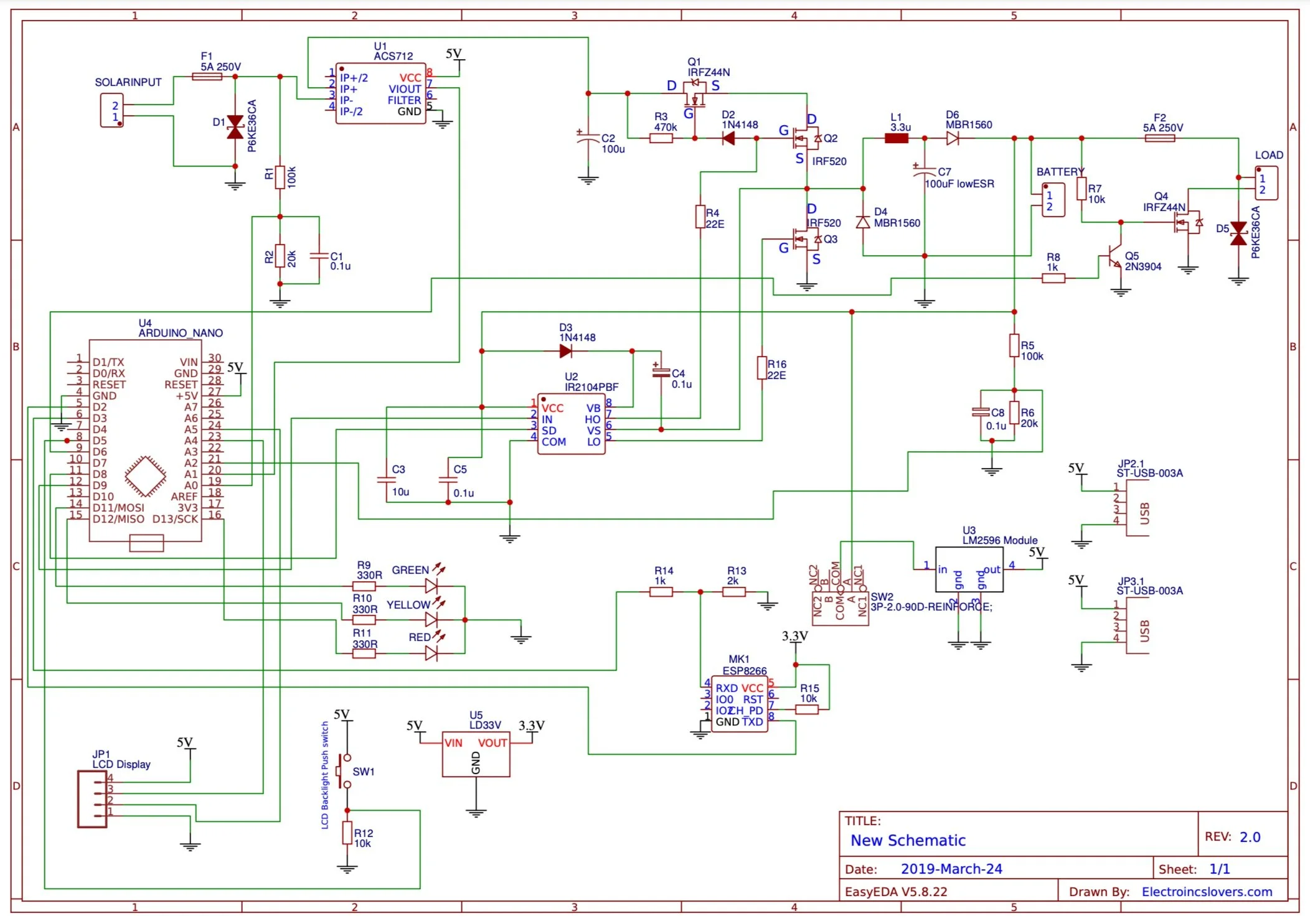 I captured the project schematic in KICAD and coded the Arduino to change the charge configuration and output load control settings based on supplied PV power and time of day.